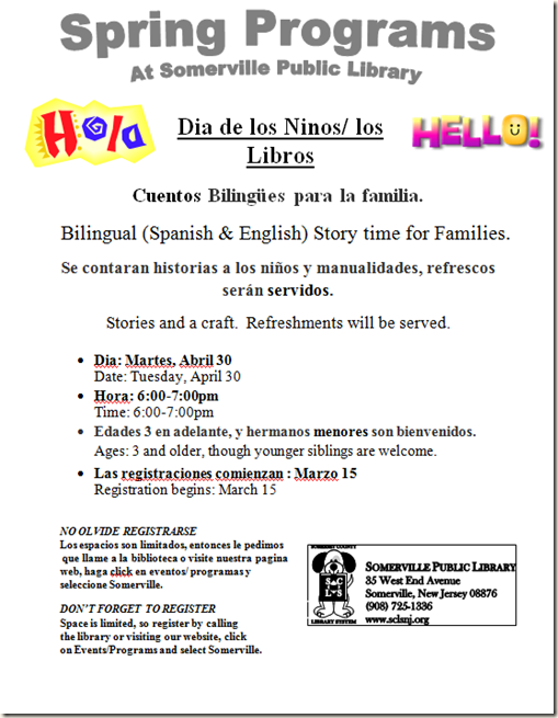 Family Storytimes (ages 2-6) Tuesdays at 10 and 1:30, Toddler Times (ages 18-36 months) Wednesdays at 10 & 11 and Thursdays at 10:30 & 11:30, Baby Times (Birth-18 months) Thursdays at 9:30. No registration is required but we ask that you only attend one session each week. Even though we have four Toddler Times each week, they are quite crowded. If your child is over 3 years old, we ask that they com to the Family Storytime instead. Thanks! Full details are posted our Calendar or you can call us at 908 526-4016 x126. We also offer a satellite storytime/craft on Wednesday mornings at 10:30 a.m. at the Neshanic Station Library.